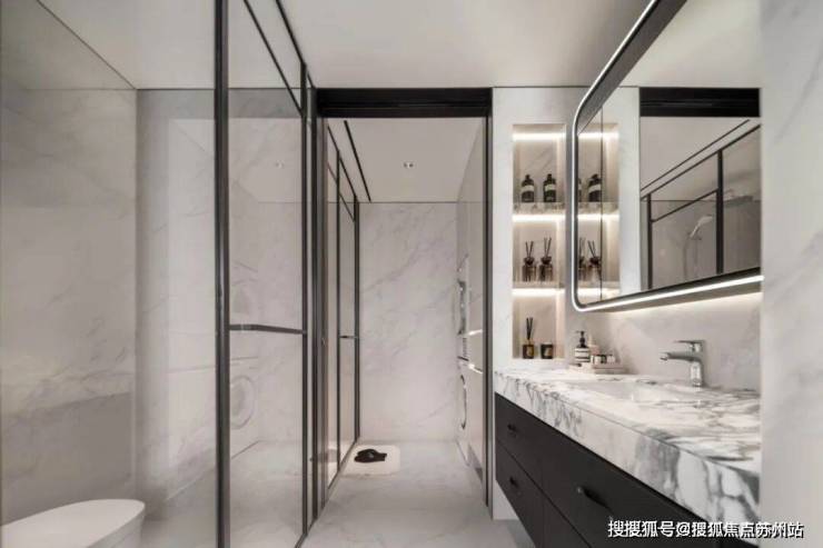 大理石地砖的铺装工艺精湛,近乎看不出拼接缝,呈现出浑然一体的效果;吊顶采用悬浮顶设计,周边用金属包边,层次感十足;卫生间墙面不乏弧形处理,地板纹路的拼法也各有不同,通过复杂的工艺,只为呈现更优的视觉效果。